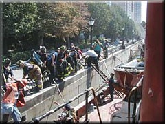 On September 11, 2001, when the World Trade Center was hit, several of the museum ship’s volunteer crew assembled and took her south to help with the Manhattan Boat Lift, helping to evacuate hundreds of people trapped by the disaster. While she was under way, FDNY contacted Harvey to ask if her pumps were working. They were. The water supply from the north had been crushed, and hydrants weren’t working south of the tower site. Harvey was redesignated Marine Company 2 and returned to service, pumping water at the seawall.